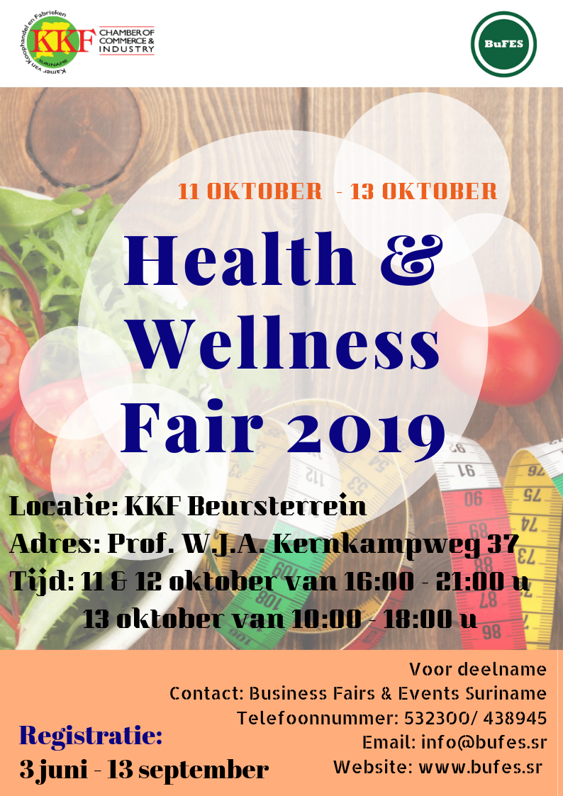 Business Fairs & Events Suriname (BUFES), organiseert haar tweede Health & Wellness Beurs van vrijdag 11 oktober tot en met zondag 13 oktober 2019 op het KKF beursterrein aan de Prof. W.J.A. Kernkampweg 37.